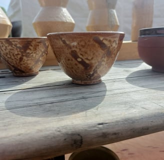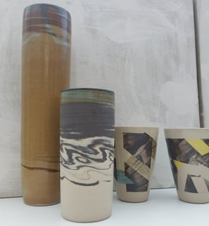 Fürs Drehen verwende ich fertige Tonmischungen, vermische diese aber meist noch einmal untereinander. Die Glasuren entstehen aus verfügbaren Gesteinsmehlen, Kreiden, Tonen, Oxiden und Holzaschen. Sie sind nach dem Brennen über 1230 Grad die funkelnde, feste, lebensmitteltaugliche Oberfläche auf dem hochgebrannten Tonkörper, dem auch schon dichten und sehr festen Steinzeug.